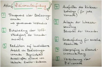 In der 4. Sitzung der AG Meilensteine vom 26. April 2012 sind mit der zu diesem Zeitpunkt vorliegenden Erkenntnisse über die Statik die Weichen gestellt worden für das gemeinsame Suchen und Finden einer Zielvariante und das Gestalten des dazu erforderlichen Arbeitsprozesses in den folgenden acht Schritten: